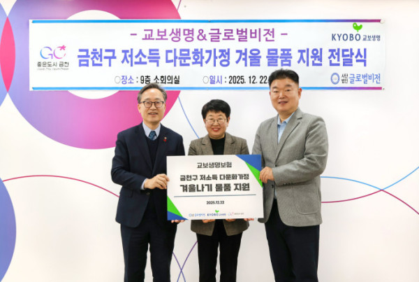 금천구청장 접견실에서 열린 전달식에는 유성훈 금천구청장과 이명길 교보생명 교보다솜이지원센터장, 사단법인 글로벌비전 김지영 사무총장이 참석해 지역사회의 어려운 이웃을 위한 협력 방안을 논의했다. 유성훈 구청장은 “금천구 내 저소득 다문화가정에 따뜻한 겨울나기 물품을 전달할 수 있도록 도움을 준 교보생명에 진심으로 감사드린다”며 기업과 지역사회의 상생과 협력의 중요성을 강조했다.