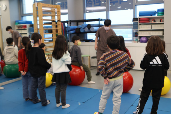 ▲연세하나병원 도수재활센터에서 진행된 ‘어린이 메디컬 캠프’ 프로그램에서 치료사의 지도로 아이들이 바른 자세와 신체 균형 교육을 받고 있다. (연세하나병원)