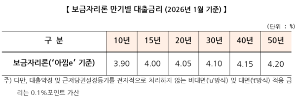 이번 금리 조정에 따라 ‘아낌e-보금자리론’ 기준 금리는 만기에 따라 연 3.90%(10년)에서 4.20%(50년)가 적용된다. 저소득 청년, 신혼가구, 사회적 배려층(장애인·한부모 가정 등) 및 전세사기 피해자 등은 최대 1.0%p의 우대금리를 적용 받아 최저 연 2.90%(10년)~3.20%(50년)에 이용할 수 있다. 대출 약정 및 등기를 비대면으로 처리하지 않는 경우 0.1%p가 가산된다.