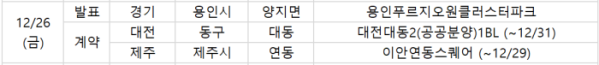 또 이날부터 29일까지는 제주 제주시 '이안연동스퀘어' 단지가, 31일까지는 대전 동구 '대전대동2(공공분양)1BL'가 정당계약을 진행한다.