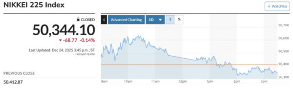 이날 마켓워치에 따르면 일본 증시 대표 지수인 닛케이225 평균주가(닛케이)는 전 거래일 대비 68.77엔(0.14%) 내린 5만0344.10엔으로 마감했다. 상승 출발한 토픽스는 오후 들어 하락 전환했다. 종가는 전날보다 15.88포인트(0.46%) 내린 3407.37로 거래를 마쳤다.