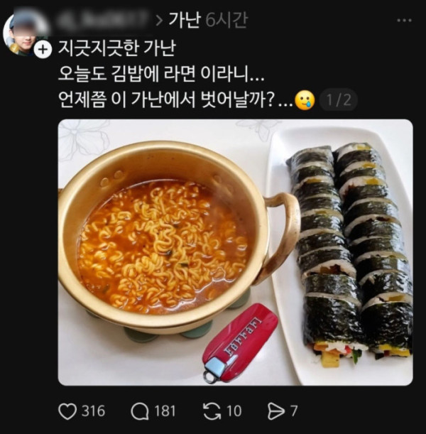 실제로 스레드에는 양은냄비에 담긴 라면과 김밥 옆에 고급 스포츠카 페라리 열쇠를 놓고 “언제쯤 이 가난에서 벗어날까”라고 적은 게시물이나, 포르쉐 운전석 사진에 “기름 넣을 돈도 없어서 오늘도 출근한다”는 문구를 붙인 게시물이 잇따라 올라왔다. 한 게시물에는 공감 1300여 개와 댓글 500여 개가 달리며 빠르게 확산됐다.