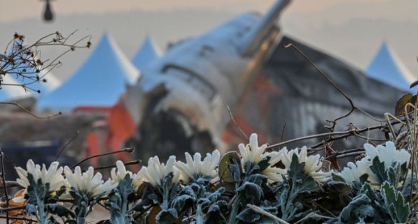 ▲ 제주항공 여객기 참사 1주기을 맞아 전남 무안군 무안국제공항 활주로 사고 현장에 파손된 여객기 동체가 놓여있다. 사고 현장 주변으로는 조문객들이 두고 간 국화가 놓여 서리를 맞고 있다. (사진제공=뉴시스)