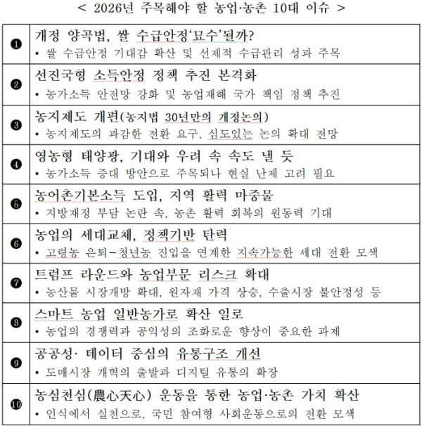 이 같은 인식 아래 연구소는 개정 양곡법을 통한 쌀 수급 안정, 선진국형 소득 안정 정책 추진, 농지법 30년 만의 개정 논의, 영농형 태양광 확대, 농어촌 기본소득 도입 등을 2026년 농정의 핵심 과제로 제시했다.