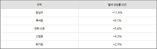 최근 3년 월세 상승률에서도 지역별 온도차가 뚜렷했다. 2022년부터 2024년 사이 왕십리는 11.6%로 가장 큰 폭의 상승률을 기록했고, 흑석동은 9.1%로 뒤를 이었다. 연희·신촌은 5.6%, 신림동은 4.3%, 회기동은 2.5%로 상대적으로 안정적인 흐름을 보였다.