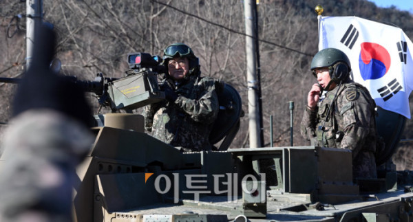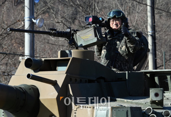 ▲우원식국회의장이 26일 오전 경기 양평군 옥천면 제11기동사단 108기계화보병대대를 방문, K2전차에 탑승 부대내를 이동하고 있다. 국회사진기자단
