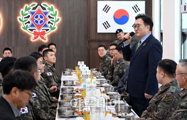 ▲우원식국회의장이 26일 오전 경기 양평군 옥천면 제11기동사단 108기계화보병대대를 방문, 장병과의 오찬에서 인삿말을 하고 있다. 국회사진기자단