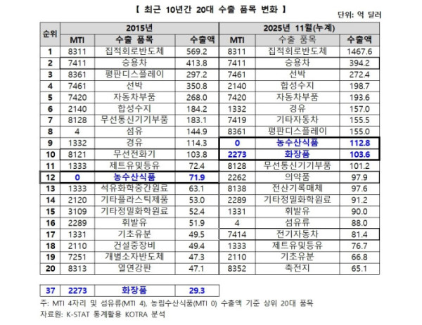 소비재 수출은 수출 구조 변화도 이끌고 있다. 화장품과 농수산식품은 올해 11월 누계 기준 MTI 4단위 10대 수출 품목에 진입했다. 두 품목의 수출액은 전기자동차와 이차전지 수출을 웃돌았다. 중소·중견기업 비중은 화장품 91.1%, 농수산식품 83.0%로, 대기업·중간재 중심이던 수출 구조에서 벗어나는 흐름이 뚜렷하다.