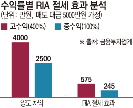 중간 수준의 수익을 낸 투자자에게도 절세 효과는 있다. 수익률 100%로 원금과 수익이 각각 2500만 원인 경우, 기존에는 약 495만 원의 양도세 부담이 발생하지만, RIA를 활용하면 절반가량인 245만 원을 아낄 수 있다. 다만 자산 배분을 바꿀 만큼의 결정적 유인으로 보기는 어렵다는 평가도 나온다.