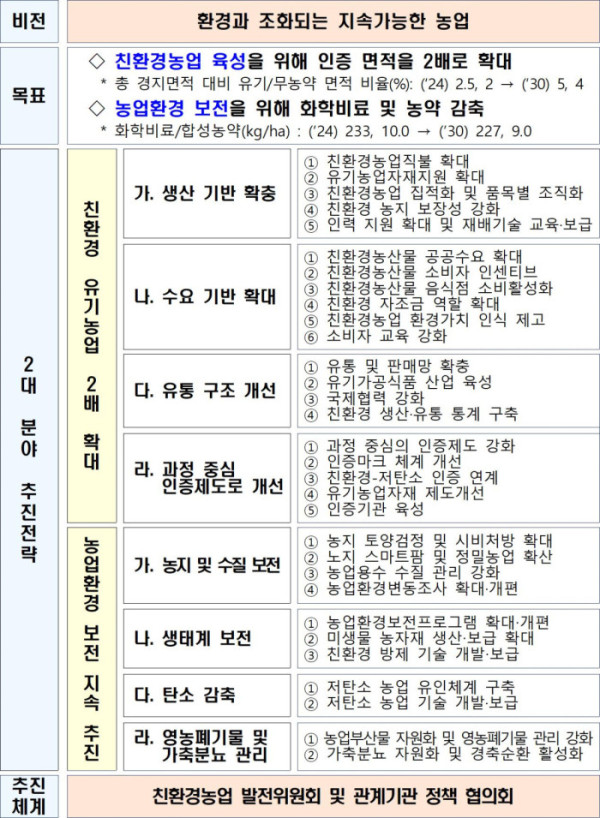 이시혜 농식품부 농식품혁신정책관은 “이번 계획을 통해 우리 농업이 지속가능한 농업으로 전환하고, 국민 인식도 친환경농업의 환경적 가치에 대해 다시 한번 주목해 친환경 농산물 가치소비가 확대되는 계기가 되길 바란다”고 말했다.