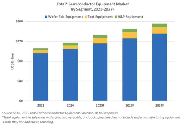 장비 시장 성장을 이끄는 핵심축은 웨이퍼 팹 장비(WFE)다. WFE 시장은 2024년 1040억 달러로 이미 사상 최대를 기록한 데 이어, 2025년에는 11% 증가한 1157억 달러로 확대될 전망이다. AI 연산 수요 증가에 따라 D램과 HBM 투자가 늘어나 공정 양산을 위한 설비 투자가 본격화되면서 장비 수요를 끌어올리고 있다. WFE 시장은 2027년까지 성장세를 이어가며 1352억 달러 규모에 이를 것으로 예상됐다.