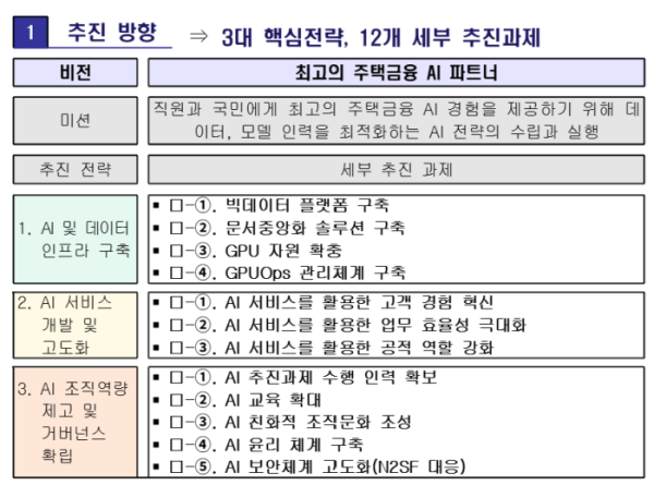 우선 AI 서비스의 기반이 될 '빅데이터 플랫폼'을 구축한다. 창립 이후 축적된 주택담보대출과 주택저당증권(MBS), 주택보증 등 방대한 금융 데이터를 통합 관리해 데이터 접근 시간을 최대 80%까지 단축한다. 이를 통해 업무 효율성을 높이는 한편, 내규나 매뉴얼 같은 비정형 문서도 AI가 학습할 수 있도록 '문서중앙화 솔루션'을 도입한다.