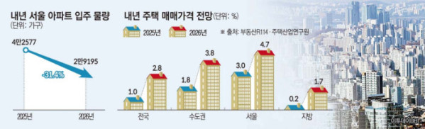 30일 업계에 따르면 주요 부동산 정보업체들은 내년 서울 아파트 입주 물량이 올해보다 30~50%가량 줄어들 것으로 내다보고 있다. 부동산R114는 내년 서울 아파트 입주 물량을 2만9195가구로 추산해 올해(4만2577가구) 대비 31.4% 감소할 것으로 전망했다. 부동산 플랫폼 직방은 감소 폭을 더 크게 봤다. 직방은 내년 입주 물량이 1만6412가구에 그쳐 올해보다 48% 줄어들 것으로 분석해 ‘공급 절벽’이 심화할 것으로 예상했다.