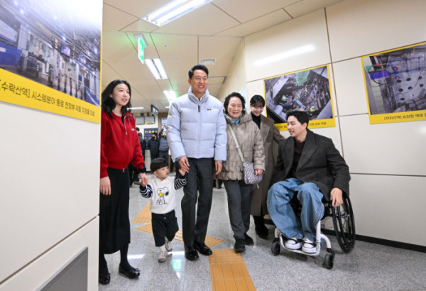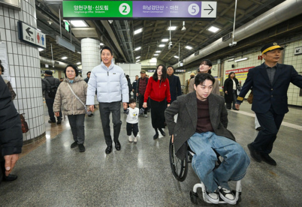 ▲오세훈 서울시장이 가수 송지은, 박위 부부를 비롯한 교통약자 대표들과 함께 29일 서울 강서구 까치산역에서 열린 ‘전역사 1역사 1동선 확보 기념행사’에 앞서 역사를 이동하고 있다. 서울시는 이날 지하철 11개 노선 338개 전 역사에 엘리베이터 설치를 마쳤다고 밝혔다. '1역사 1동선'은 휠체어 이용자 등 교통약자가 타인의 도움 없이 엘리베이터만으로 지상에서 승강장까지 이동할 수 있는 동선을 뜻한다. 신태현 기자 holjjak@