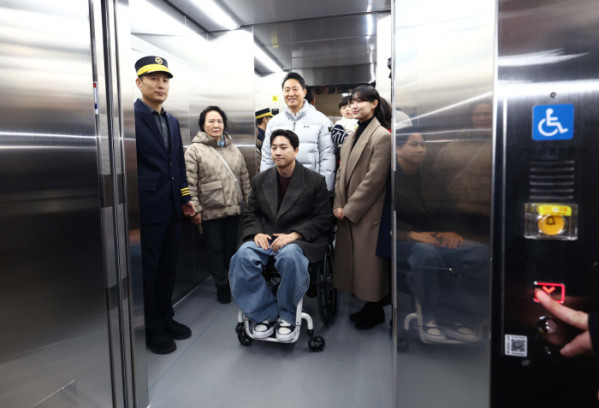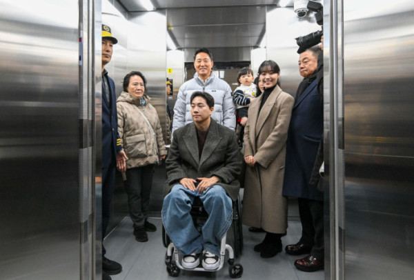 ▲오세훈 서울시장이 가수 송지은, 박위 부부를 비롯한 교통약자 대표들과 함께 29일 서울 강서구 까치산역에서 열린 ‘전역사 1역사 1동선 확보 기념행사’에 앞서 신설 엘리베이터에 탑승하고 있다. 서울시는 이날 지하철 11개 노선 338개 전 역사에 엘리베이터 설치를 마쳤다고 밝혔다. '1역사 1동선'은 휠체어 이용자 등 교통약자가 타인의 도움 없이 엘리베이터만으로 지상에서 승강장까지 이동할 수 있는 동선을 뜻한다. 신태현 기자 holjjak@