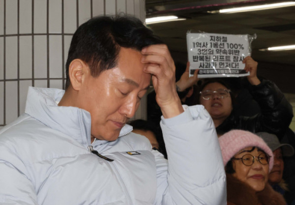 ▲오세훈 서울시장이 29일 서울 강서구 까치산역에서 열린 ‘전역사 1역사 1동선 확보 기념행사’에 참석한 가운데 전국장애인차별철폐연대(전장연) 관계자가 손피켓을 들고 리프트 참사 사과를 요구하고 있다. 서울시는 이날 지하철 11개 노선 338개 전 역사에 엘리베이터 설치를 마쳤다고 밝혔다. '1역사 1동선'은 휠체어 이용자 등 교통약자가 타인의 도움 없이 엘리베이터만으로 지상에서 승강장까지 이동할 수 있는 동선을 뜻한다. 신태현 기자 holjjak@