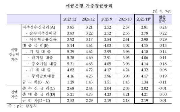 저축성 수신(예금) 금리는 연 2.81%로 10월보다 0.24%포인트 오르며 석 달째 상승했다. 예금금리 상승 폭이 대출금리보다 크게 나타나면서 신규 취급액 기준 예대금리차는 1.34%포인트로 전월 대비 0.11%포인트 축소됐다.