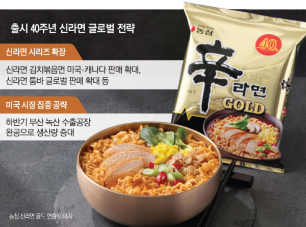 2일 식품업계에 따르면 농심은 올해 신라면 출시 40주년을 기점으로 부산 녹산 수출전용공장을 올해 완공하는 것을 기점으로 다시 연구개발(R&D) 역량을 집중해 한번 더 도약에 나선다. 여기에 미국 캘리포니아 1·2공장 등 현지 생산을 확대해 신라면의 글로벌 시장 공략에 속도를 낸다는 전략이다.
