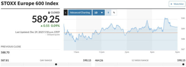 범유럽 주가지수인 스톡스유럽600 지수는 전 거래일 대비 0.55포인트(0.09%) 오른 589.25에 마감했다. 독일 프랑크푸르트증시 DAX30지수는 11.06포인트(0.05%) 상승한 2만4351.12에, 영국 런던증시 FTSE100지수는 4.15포인트(0.04%) 내린 9866.53에, 프랑스 파리증시 CAC40지수는 8.44포인트(0.10%) 오른 8112.02에 거래를 마쳤다.