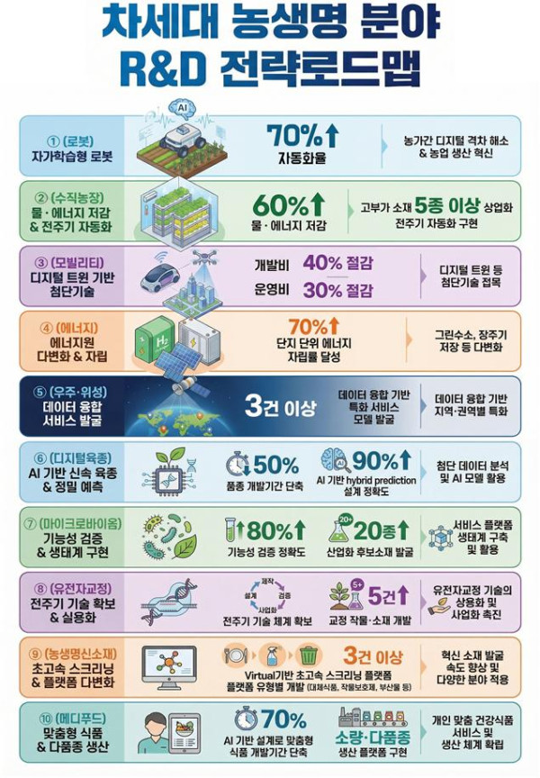 이번 로드맵의 핵심은 농업을 단순 1차 산업이 아닌 첨단 기술 산업으로 전환하는 데 있다. 정부는 농업·농촌을 둘러싼 대내외 환경 변화와 국가전략기술을 종합적으로 고려해 △로봇 △수직농장 △모빌리티 △에너지 △우주·위성 △디지털육종 △마이크로바이옴 △유전자교정 △농생명 신소재 △메디푸드 등 10대 전략기술 분야를 선정하고, 향후 5년간의 분야별 R&D 추진 방향을 제시했다.