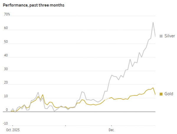 29일(현지시간) 월스트리트저널(WSJ)은 은 선물 가격이 전 거래일 대비 8.7% 급락했다고 보도했다. 구리 가격은 4.8%, 금값은 4.5% 하락했다. 세 가지 원자재 모두 올해 급등하면서 사상 최고치 부근에 머물고 있었지만, 이날은 달랐다.