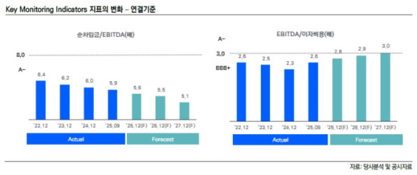 한신평은 주요 모니터링 지표로 순차입금/EBITDA 8배 이하, EBITDA/이자비용 3배 이상 유지 여부를 제시했다.