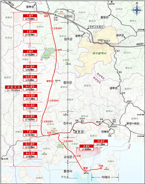 남부내륙철도(김천~거제) 건설사업 제8-1공구는 경북 김천에서 경남 거제까지 총연장 174.6km, 총사업비 7조974억 원이 투입되는 대규모 고속철도 건설사업이다. 두산건설은 경남 고성군 일원을 통과하는 구간의 시공을 맡는다. 해당 노선은 설계속도 250km/h의 고속철도로 전 구간 개통 시 서울~거제 이동 시간이 약 2시간 30분대로 단축돼 남부권 철도 교통망 확충과 지역 균형발전에 기여할 것으로 기대된다.