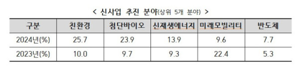 이는 전년 대비 무려 35.2% 폭증한 수치다. 설비투자 역시 23조4000억 원으로 견조한 흐름을 유지했다. 신사업 추진 분야에서는 친환경(25.7%), 첨단 바이오(23.9%), 신재생 에너지(13.9%)가 상위권을 차지했다. 이는 탄소중립과 헬스케어 시장 선점 의지를 보여준다.