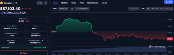 30일 코인마켓캡에 따르면 한국시간 오전 10시 30분 현재 비트코인은 24시간 전 대비 0.91% 하락한 8만7103.40달러에 거래되고 있다.