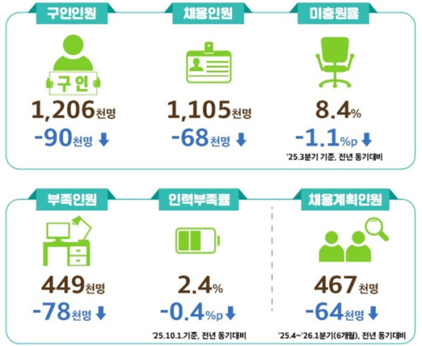 사업체 규모별로 300인 이상은 부족인원이 4만6000명으로 2000명 줄었으나, 채용 계획인원은 5만7000명으로 5000명 증가했다. 반면, 300인 미만은 부족인원(40만4000명, -7만6000명)과 채용 계획인원(41만 명, -6만9000명)이 모두 감소했다.