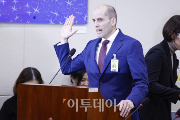 ▲해롤드 로저스 쿠팡 대표이사가 30일 서울 여의도 국회에서 열린 쿠팡 침해사고 및 개인정보 유출, 불공정 거래, 노동환경 실태 파악과 재발방지 대책 마련을 위한 연석 청문회에 출석해 증인 선서하고 있다. 조현호 기자 hyunho@