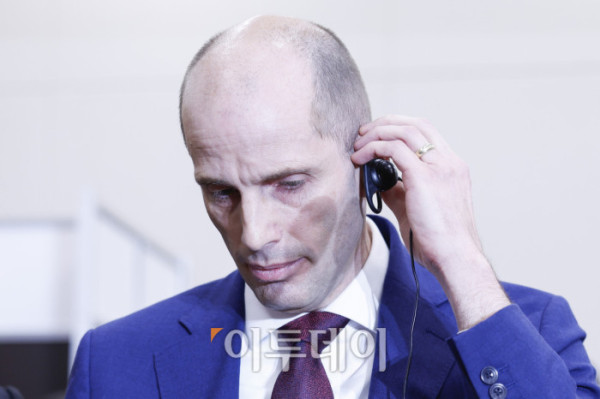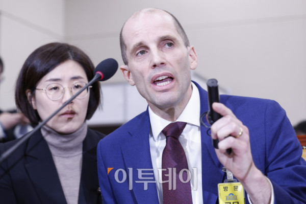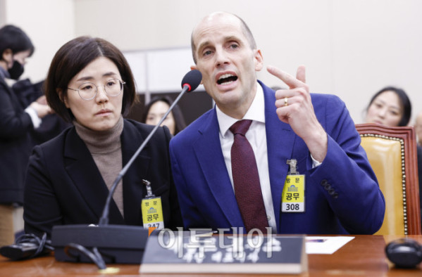 ▲해롤드 로저스 쿠팡 대표이사가 30일 서울 여의도 국회에서 열린 쿠팡 침해사고 및 개인정보 유출, 불공정 거래, 노동환경 실태 파악과 재발방지 대책 마련을 위한 연석 청문회에 출석해 최민희 과학기술정보방송통신위원회 위원장의 동시통역기 착용 요구에 통역기를 착용하고 있다. 조현호 기자 hyunho@