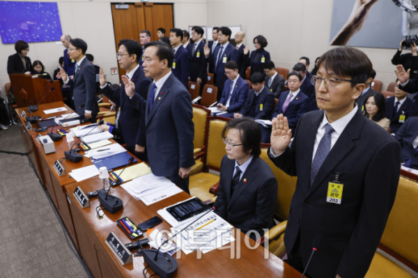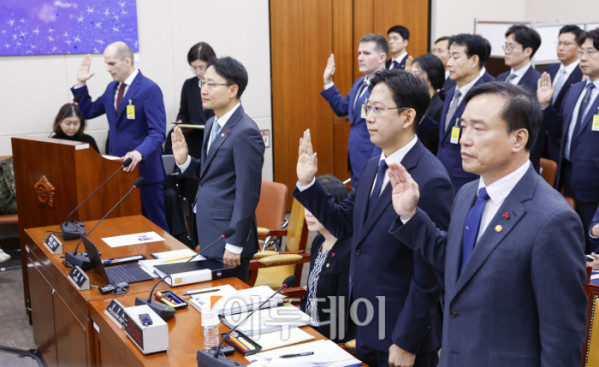 ▲박대준 전 쿠팡 대표이사가 30일 서울 여의도 국회에서 열린 쿠팡 침해사고 및 개인정보 유출, 불공정 거래, 노동환경 실태 파악과 재발방지 대책 마련을 위한 연석 청문회에 출석해 증인 선서하고 있다. 조현호 기자 hyunho@