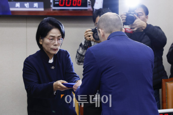 ▲해롤드 로저스 쿠팡 대표이사가 30일 서울 여의도 국회에서 열린 쿠팡 침해사고 및 개인정보 유출, 불공정 거래, 노동환경 실태 파악과 재발방지 대책 마련을 위한 연석 청문회에서 증인 선서를 마친 후 선서문을 최민희 과학기술정보방송통신위원회 위원장에게 전달하고 있다. 조현호 기자 hyunho@