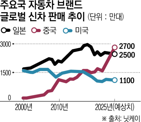 과거 세계 자동차 시장은 미국과 일본이 경쟁하던 구도였다. 정점이었던 2018년에는 일본이 3000만 대 가까이 판매했다. 또 2022년에는 중국과의 격차가 약 800만 대에 달했으나 불과 3년 만에 역전을 허용하게 됐다.