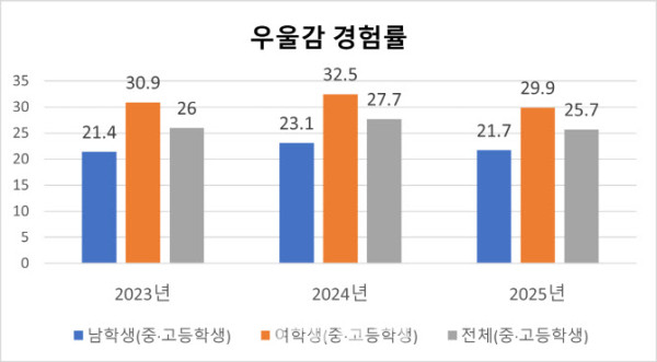 교육부에 따르면 전국 초·중·고 학생 자살 건수는 2020년 148명에서 2021년 197명, 2022년 194명, 2023년 214명, 2024년 221명으로 증가세를 보였다. 2020년 대비 4년 새 49%(73명) 늘어난 것이다. 우울감을 경험한 학생 비율도 2023년 26%, 2024년 27.7%, 2025년 25.7%로 매년 25% 안팎을 기록하고 있다. 우울감 경험률은 ‘최근 1년간 2주 내내 일상생활을 중단할 정도의 절망감 등을 느낀 적이 있다’고 응답한 비율을 의미한다.