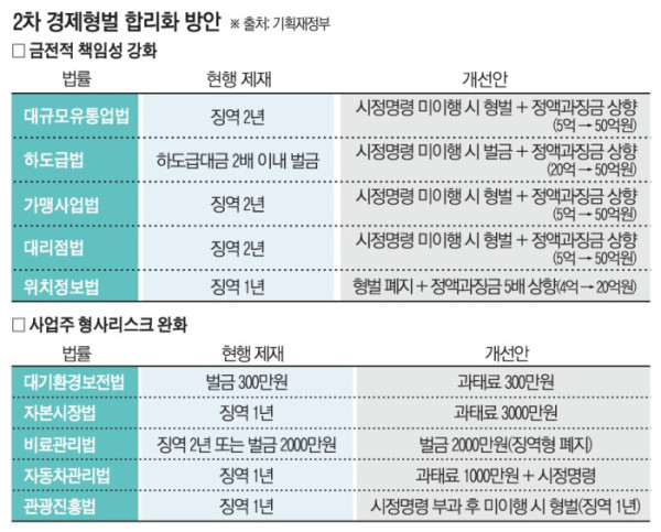 정부·여당이 발표한 ‘2차 경제형벌 합리화 방안’을 두고 경제계는 전반적으로 환영 입장을 내놨다. 사업주의 고의가 없는 경미한 위반이나 단순 행정의무 위반을 형벌 대신 과태료·시정명령으로 전환한 점이 정상적인 기업 활동에 활력을 불어넣을 수 있다는 평가다. 다만 형사 리스크를 낮추는 대신 금전적 책임을 대폭 강화하는 방식이 또 다른 기업 부담으로 이어질 수 있다는 우려도 제기된다.