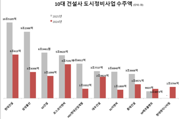30일 정비업계에 따르면 시공능력평가 상위 10대 건설사의 올해 도시정비사업 수주 총액은 48조6655억 원으로 집계됐다. 이는 지난해(27조8701억 원) 대비 74.7% 증가한 규모로 2022년(42조936억 원)을 넘어 역대 최대 실적이다.