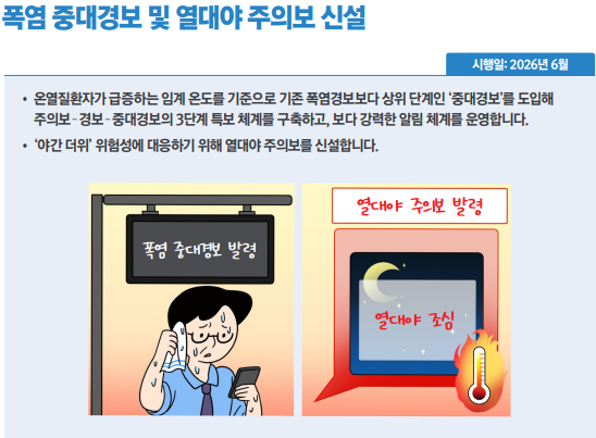 기후변화에 따른 폭염의 장기화·정례화 대응을 위한 폭염 중대경보가 도입된다. 폭염 중대경보는 온열질환자 수가 급증하는 임계온도를 기준으로 하는 폭염 경보의 상위 단계 알림 체계다. 야간 더위 위험 대응을 위한 열대야 주의보도 시행된다. 기상요소와 특보발표 빈도 등을 종합적으로 고려해 지역별 주의보 기준을 차등 설정 및 운영할 계획이다. 내년 여름(6월)부터 시범운영이 실시된다.