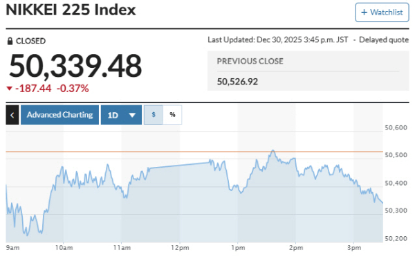 다만 주가가 크게 떨어질 만한 재료가 없다는 인식 속에 일부 매수가 발생하면서 낙폭은 제한적이었다. 장중 한때 상승 전환하는 장면도 있었다. 그 결과 연말 시점으로는 처음으로 종가가 5만 엔선을 기록했다. 일본은 이날이 올해 폐장일이다.