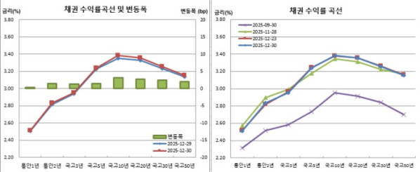 30일 채권시장과 금융투자협회에 따르면 통안2년물은 1.5bp 상승한 2.833%를, 국고3년물은 1.3bp 오른 2.952%를 보였다. 국고10년물은 3.1bp 상승한 3.385%를, 국고30년물은 2.4bp 올라 3.257%를 나타냈다.