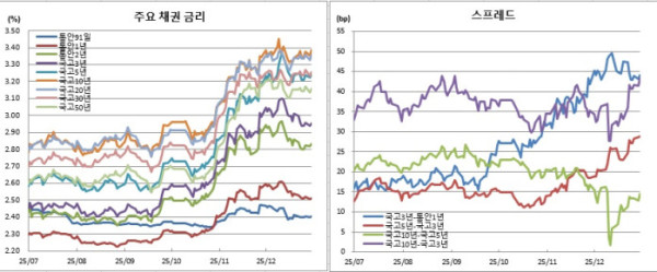 한국은행 기준금리(현 2.50%)와 국고3년물간 금리차는 45.2bp로 확대됐다. 국고채 10년물과 3년물간 스프레드는 1.8bp 확대된 43.3bp를 나타냈다. 이는 9월3일(43.8bp) 이후 최대 격차다.