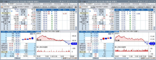 ▲30일 국채선물 장중 흐름. 왼쪽은 3년 선물, 오른쪽은 10년 선물 (체크)