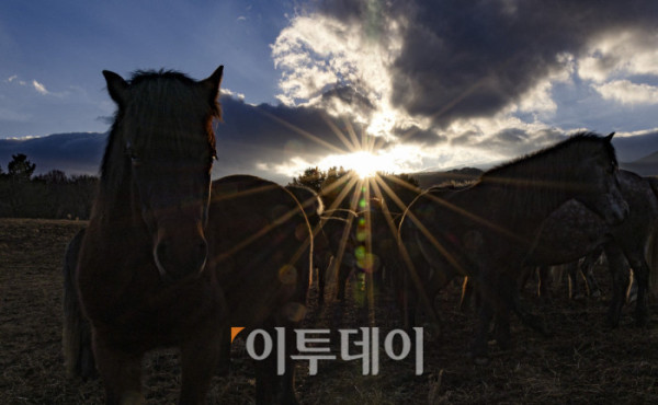 ▲제주시 제주축산생명연구원에서 제주마 뒤로 병오년(丙午年) 새해 첫 태양이 떠오르고 있다. 을사년(乙巳年)은 코스피 4000 돌파, 삼성전자 주가 10만원 돌파, 누리호 4차 발사 성공 등 한국 경제와 산업 전반에 새로운 도약의 이정표가 세워졌다. 들판을 뛰어다니는 제주마처럼 힘차게 나아가는 새해가 되기를 기대한다. 조현호 기자 hyunho@
