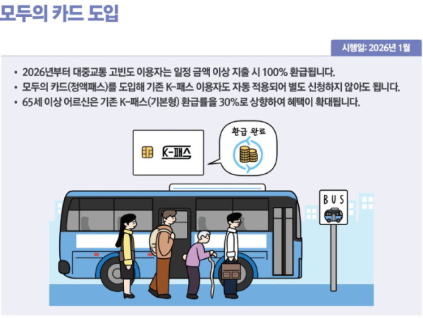 먼저 국토교통부는 2026년 1월부터 대중교통비 환급 상한을 없앤 K-패스 카드 ‘모두의 카드’를 새롭게 도입한다.