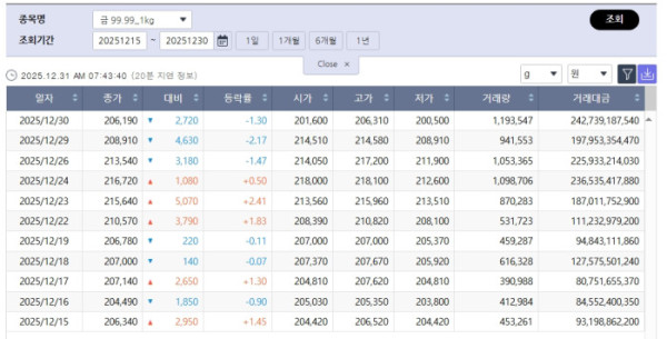한국거래소(KRX) 금시장에 따르면 30일 기준 금 1kg 종가는 1g당 20만6190원으로 전 거래일 대비 1.30% 하락했다. 최근 흐름을 보면 국내 금 가격은 12월 중순 20만4000원대에서 출발해 23일 장중 21만6000원 선까지 급등한 뒤, 이후 하락 전환하며 다시 20만6000원 안팎으로 내려왔다.