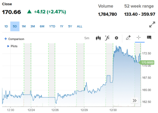 ▲몰리나헬스케어 주가 추이. 30일(현지시간) 종가 170.66달러. 출처 CNBC