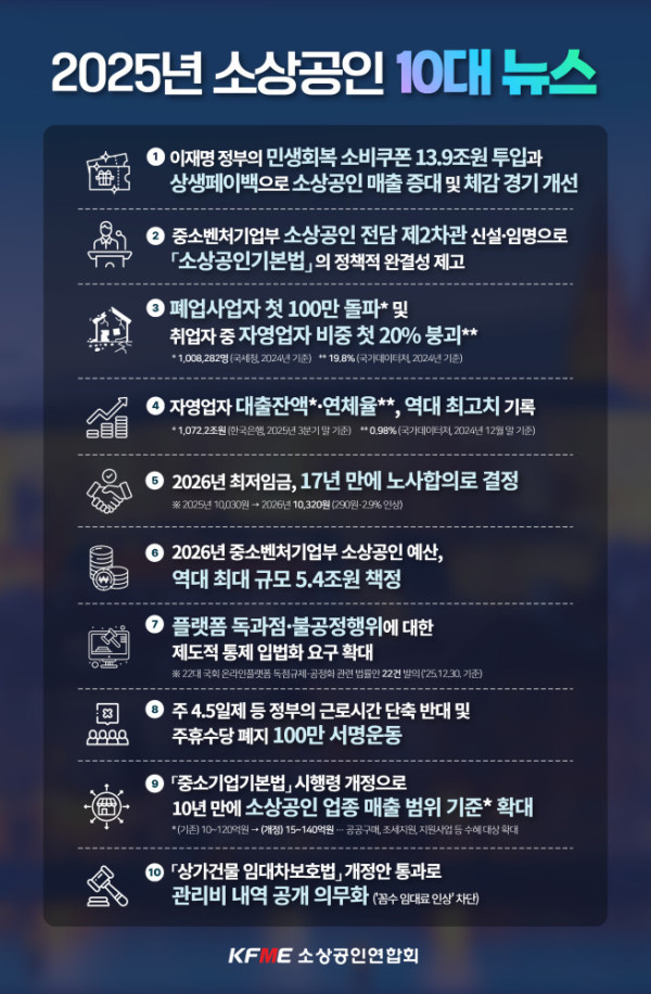 소상공인 업계의 2025년 10대 뉴스에 민생회복 소비쿠폰과 중소벤처기업부의 소상공인 전담차관 신설 등이 꼽혔다.