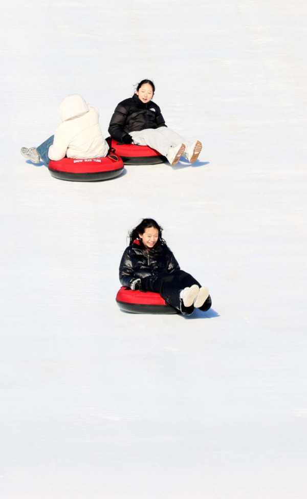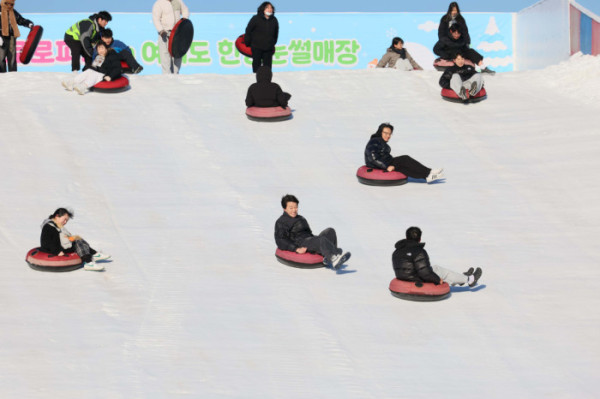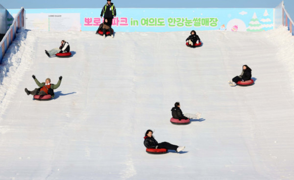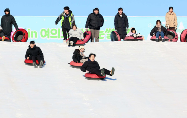 서울 한강눈썰매장이 개장한 31일 서울 여의도 한강공원 눈썰매장에서 시민들과 외국인 관광객들이 눈썰매를 타며 즐겁게 한 해를 마무리하고 있다. 서울시는 이날부터 내년 2월 18일까지 총 50일간 뚝섬, 잠원, 여의도 한강공원 3곳에 눈썰매장을 운영한다. 운영 시간은 매일 오전 10시부터 오후 5시까지다. 기상 악화로 안전 우려가 있으면 시간이 조정될 수 있다. 매일 오후 1시부터 2시까지는 슬로프 관리를 위한 눈 정리 작업으로 시설 운영이 잠시 중단된다. 잠원 한강공원은 연말, 연초 분위기를 낼 수 있도록 개장일부터 1월 4일까지 매일 야간 개장한다. 이후에는 매주 주말에 오후 8시까지 운영한다.