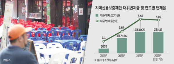 1일 중소벤처기업부에 따르면 지역신용보증재단의 대위변제액은 지난해 11월(2조437억 원) 2조 원을 넘어섰다. 대위변제액은 은행 대출을 제 때 갚지 못해 보증기관인 지역신보가 대신 상환하는 돈을 의미한다. 2022년 5076억 원 수준이었던 대위변제액은 2023년 1조7126억 원으로 폭증한 뒤 2024년(2조4005억 원) 처음으로 2조 원을 돌파했다. 지역신보가 대신 갚아준 돈이 2년 연속 2조 원을 넘어섰다. 대위변제율은 지난해 5.07%로 전년(5.66%)보다 낮지만 2021년(1.01%), 2022년(1.10%), 2023년(3.87%)과 비교하면 급격히 높아졌다.
